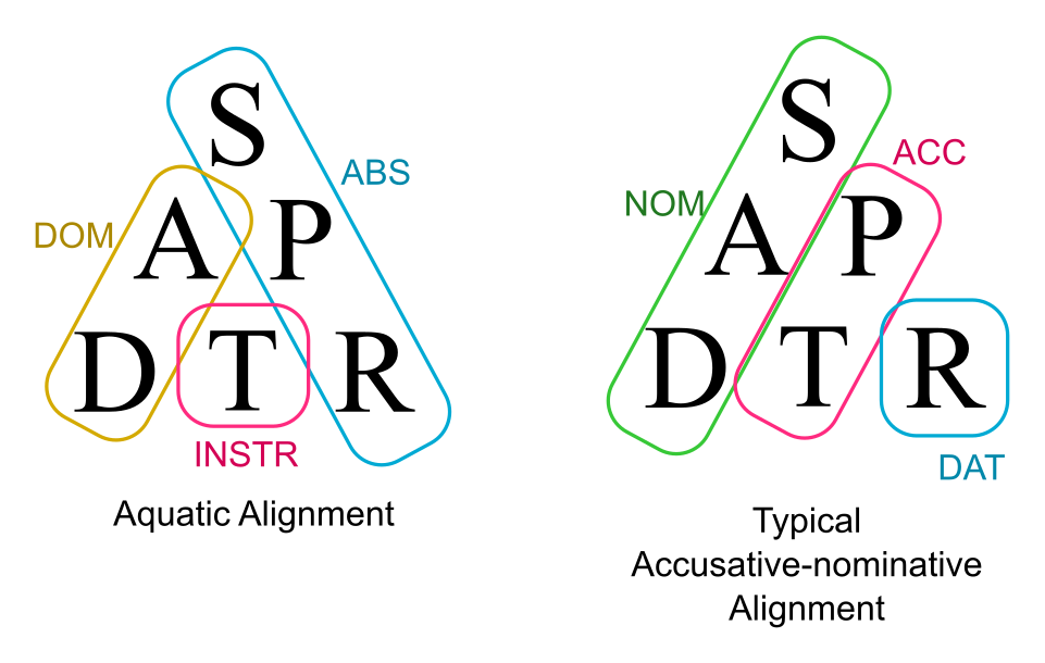 Equally intriguing is Naderian's treatment of arguments in clauses, which while not unattested, is still close to unique. The distinction between subject, direct object and obliques is foregone for a system more based on degrees of agency, separating Agents (doers), Patients (experiencers) and Themes (instruments). ECN holds the Patient in highest regard as an essential component of phrases and that can almost never be omitted. As an example, ``the child kicks the ball'' can not be shortened to ``the child kicks'', but ``kicks the ball'' would be perfectly grammatical. The ball getting kicked is the big scoop, who did it is secundary. A popular adage states that the language encodes the belief that events can only really be said to happen if there is someone to suffer them.